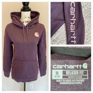 Carhartt Clarksburg graphic logo hoodie! Super soft and cozy fabric; thick and high quality. Kangaroo pocket; logo at chest and down sleeve. Perfect for work and casual wear. Awesome heathered purple color with pinkish/lavender graphics; hard to find!