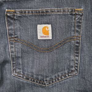 Classic Carhartt denim work jeans in a durable blue wash. Built with a sturdy straight-leg silhouette and traditional 5-pocket design, these jeans are made for everyday wear and work use. Features reinforced stitching, belt loops, button-zip closure, and signature Carhartt back pocket logo patch. Style code B01 shown on interior tag.