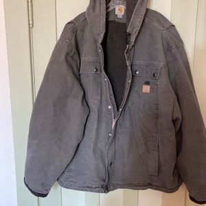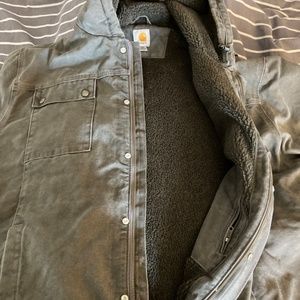 This new/never worn Carhartt utility jacket is lined throughout the body and hood with soft Sherpa fleece, and reinforced with Cordura® at wear points along the cuffs.