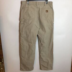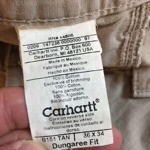 Carhartt dungaree fit tan cotton cargo work utility pants. These are lighter weight cotton, not the heavy weight stiff Carhartt canvas type of fabric. Still a nice weight though to them. Marks on pants as photographed. These have been freshly washed, but I did not pre-treat prior to washing, as I didn’t notice the spots. Otherwise in great used condition and would make great work pants. Size 36x32. Actual measurements are in photos. Please note*** tag says 36x34. The actual inseam measures at just barely over 32”.***. I find this pretty common with Carhartt pants where the inseam measurement is slightly less than the tag. I am guessing that this is from washing and drying the pants. These are perfectly broken in!
