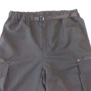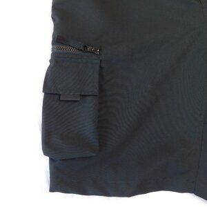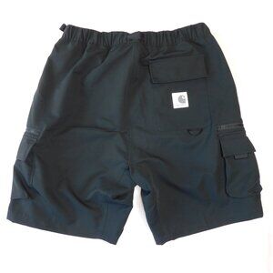 Carhartt black WIP Elmwood Shorts. These shorts feature cargo pockets at the side leg and an adjustable belt for a utilitarian vibe. Relaxed fit. Elasticated waist. Adjustable belt. I think these are the WIP (Work In Progress) style. Size medium. Flaw: there is an un-professional repair on the left side tush - pictured. In good used condition.