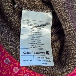 100% acrylic rib knit. Fold-up cuff with Carhartt patch. Color is brown and sandstone. One size fits all. Unisex