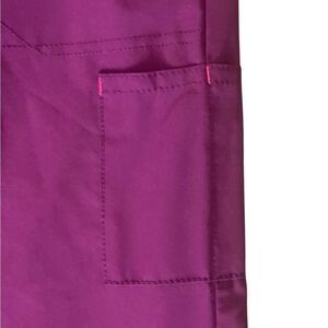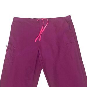 Comfortable purple scrub pants. Features a pink drawstring. Ideal for medical professionals.