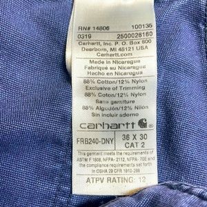 Gently used condition CARHARTT Flame Resistant pant Size 36 x 30, color Navy Blue.
