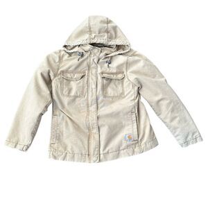 Carhartt Fargo Coat in size medium. The jacket is pre-owned and perfectly worn in. There are no rips- minor wear. There is a small discoloration spot on the hood.