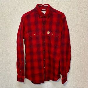 Carhartt Flannel Shirt Mens Small Red Black Plaid Button Down 100% Cotton Rugged