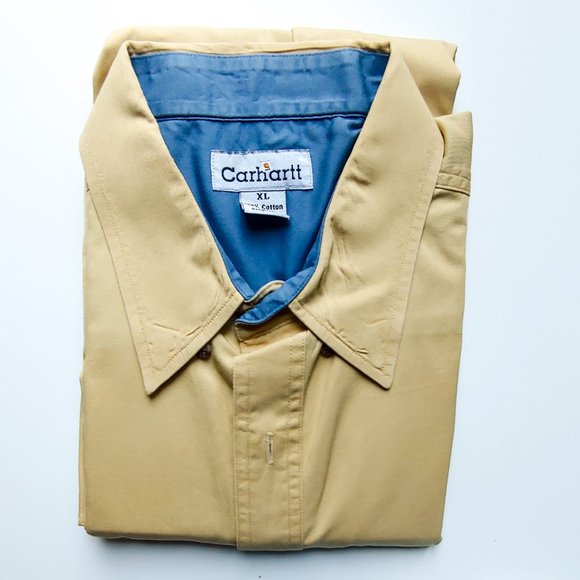 Carhartt's short-sleeve chambray shirt is perfect for warmer weather, made of 4.5-ounce, 100 percent ring-spun cotton, it is garment washed for a soft finish, it features a button down collar, two chest pockets with button closures and a back yoke with a centered box pleat for ease of movement
