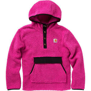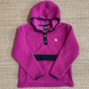 Carhartt girls youth size XL (14) pullover hooded quarter snap sweatshirt with soft Sherpa exterior and front kangaroo pocket and large Velcro center pocket. Excellent clean condition.