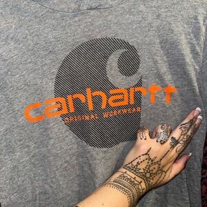 Carhartt gray long sleeve tee with hoodie, featuring an orange logo. Small snag pictured in the photos, otherwise great condition.