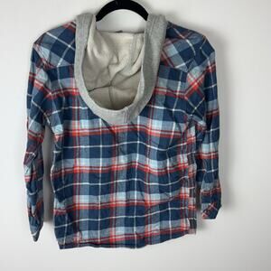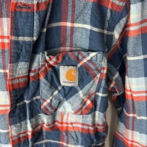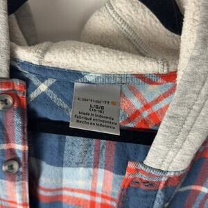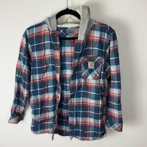 Gently Used Carhartt Button Down Flannel Hoodie. This is a girls large (14-16). It could also be unisex in my opinion based on style. White, blue, and orange plaid pattern. Front pocket with a Carhartt patch on it. Hoodie is plain gray, which makes it look like a hoodie under the flannel. 100% cotton.