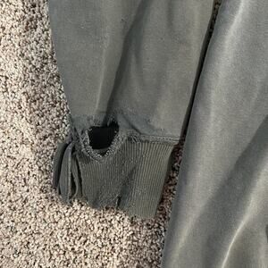 Condition: Poor—heavy wear throughout. Noticeable hole on front pocket and both cuffs have significant tearing. General fading, discoloration, and heavy wear consistent with frequent use. See all photos for details of flaws.