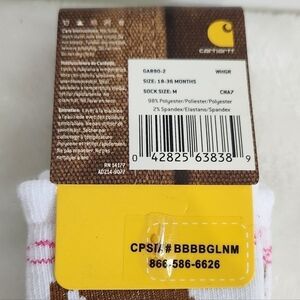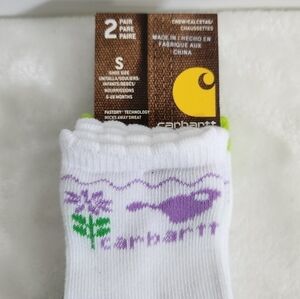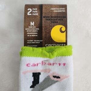 NWT Carhartt Infant Toddler White Crew Grip Socks. 4 Pack. 2 size smalls, 6-18 months. 2 size medium, 18-36 months. Great for gift giving! 1 purple, 2 lime green & 1 pink. Patterns include birds, flowers, tools, & a horse. Fast dry technology, wicks away sweat, arch support, 98% polyester, 2% spandex. Brand new with tags! 4 (4 packs) sets available!
