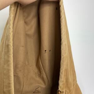 In good preowned condition, some signs of wear. Distress, discoloration, small cigarette burn, and spots. Work, outdoors, field work. See measurements in pictures. Multiple pockets.