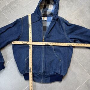 This rare vintage Carhartt hooded work jacket (model JF858) is a classic piece of American workwear. Made in the USA and union made in 1991, this jacket features a rugged denim outer shell and a cozy blue plaid flannel lining, designed for both durability and comfort.