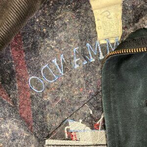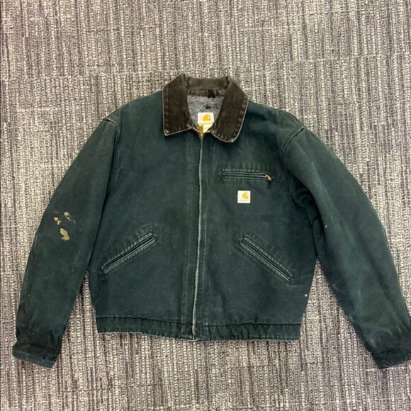 Well loved Carhartt jacket in dark green. Features a zip-up front and multiple pockets and embroidered back.