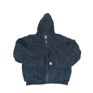 Carhartt Hooded Workwear Bomber Jacket Men's Size 3XLT The Carhartt J140 BLK Jacket is a stylish and durable men's outerwear piece designed for cold weather conditions. Made in the USA with high-quality materials, this black hooded jacket features a quilt-lined design for added warmth and comfort. The cotton canvas outer shell is durable and machine washable, while the polyester lining ensures softness and insulation. Perfect for casual wear, travel, or outdoor activities like walking, hunting, and hiking, this vintage-inspired jacket is a versatile and practical choice for any man's wardrobe.