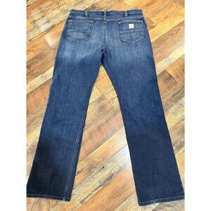 This Carhartt jeans for men are in size 40 with a 34-inch inseam and feature a dark blue denim fabric with a straight fit. The jeans have a Western cowboy-inspired style, making them suitable for workwear. The closure options include a zip and button, and the material is made of comfortable cotton. These jeans also have pockets for added convenience and are designed with the Carhartt brand logo, reflecting a 90s theme.