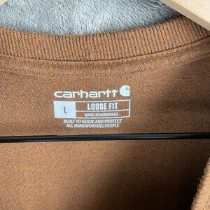 Classic Carhartt K87 workwear tee in a rugged brown tone. Features a loose fit, short sleeves, and signature chest pocket with Carhartt logo patch. Built with a sturdy cotton-poly blend for durability. Great everyday essential for work, layering, or casual wear.