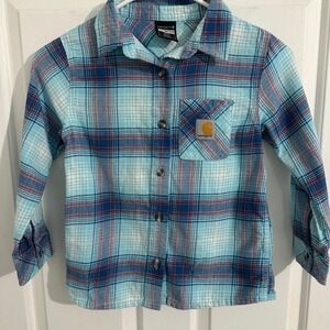 Keywords: Carhartt, Kids, Flannel shirt, Plaid, Long sleeve, Button up, Top, Blue, Size 6, Children's clothing, Casual wear, Durable, School clothes