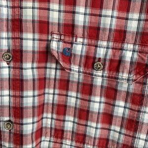 Carhartt men’s short sleeve button-up shirt in a classic red plaid pattern. Size Large. Made of 100% cotton for breathable comfort and durability. Great casual workwear or everyday style.