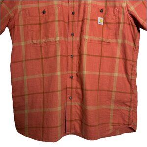 The Carhartt Large Relaxed Rugged Flex Button Up Shirt in orange plaid is a versatile piece of men's workwear suitable for various occasions such as travel, casual outings, and everyday wear. Made from cotton fabric and featuring a button-down collar, this shirt is designed for easy care and all seasons use. With a relaxed fit and short sleeves, it provides comfort and style, while the woven construction and embroidered accents add a touch of durability and quality. Perfect for the outdoor enthusiast or those looking for a classic yet rugged look in their wardrobe.