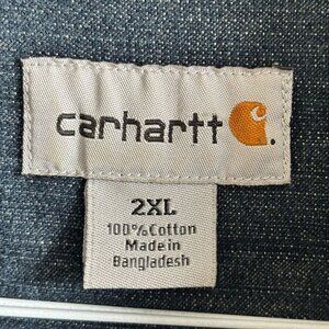 Rugged and timeless, this blue Carhartt denim jacket features a classic button-down front, collared neckline, and durable long sleeves. Perfect for layering, it offers reliable comfort and style in size XXL – built for work and weekend wear alike.