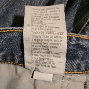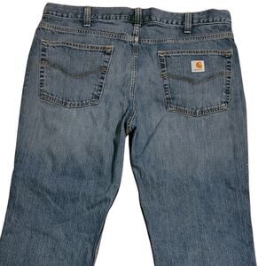 Carhartt men’s relaxed straight leg jeans, size 38x30. Medium blue denim in 100% heavyweight cotton for durability. Classic 5-pocket style with slightly tapered leg, logo patch on back pocket, and sewn-on belt loops. Made in Mexico, style 3320-WTB. Pre-owned with light distressing and a small hole near side pocket—see photos. Rugged workwear piece equally at home in casual retro, minimalist, or gorpcore styling.