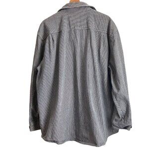 Classic Carhartt men’s long sleeve half-zip shirt jacket in a blue and white hickory stripe pattern. Features dual button chest pockets, button cuffs, and durable 100% cotton fabric. Made for comfort and function, this versatile piece works great as a lightweight work shirt or shacket-style outer layer. Note: there’s a faint stain on the back near the right seam (see photos).