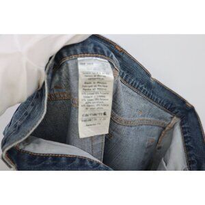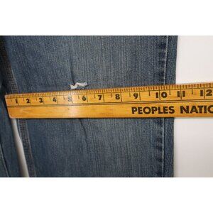 Distressed tears on the front legs. Measurements: Waist = 36 inches, Inseam = 32 inches, Front rise = 10 inches, Leg opening = 9 inches.