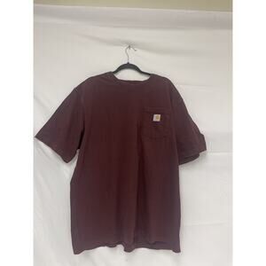 This is a pre-owned Carhartt Men's long sleeve t-shirt in a deep burgundy color. It features the iconic Carhartt logo patch on the chest pocket and is designed with an "Original Fit" for comfortable everyday wear. The shirt is made from 100% cotton, ensuring durability and breathability, characteristic of Carhartt's renowned workwear quality.