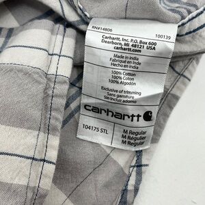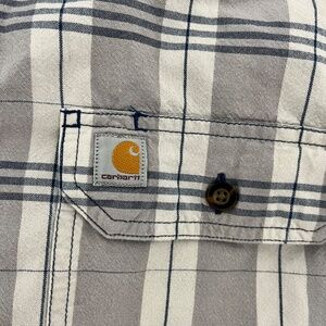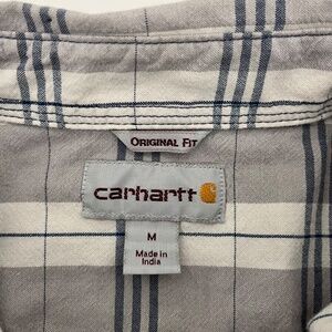 The Carhartt Men's Button-Down Shirt in size M and gray plaid is a versatile piece perfect for travel, casual wear, or work.