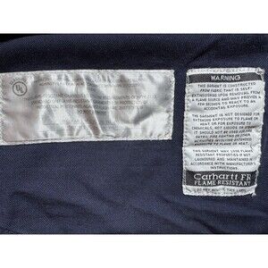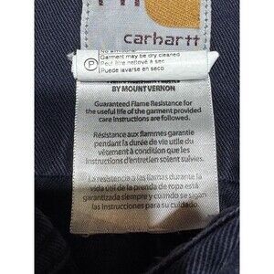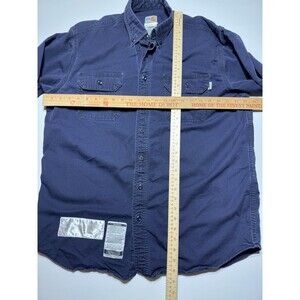 Carhartt Flame Resistant long-sleeve button-down work shirt. Navy blue color, size Large Regular. Features dual front button pockets, FR Carhartt branding, and compliant safety labels. See measurements and condition notes below.