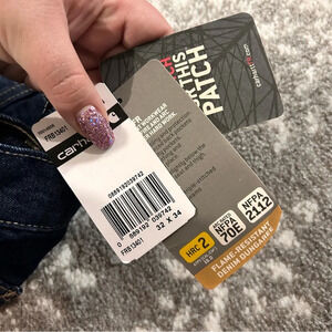 Carhartt FR label sewn on back pocket; NFPA 2112/CAT 2 label sewn on front waistband