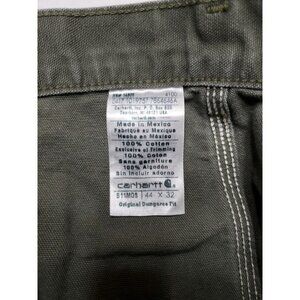 The Carhartt Men's Green Loose Fit Cargo Carpenter Pants in size 44 x 32 are versatile and practical for any season. Made of durable denim fabric with a relaxed fit, these pants feature a zip and button closure, cargo pockets, and a straight style. The green color adds a solid touch to the solid pattern, while the brand's logo accents add a touch of USA-themed flair. With a comfortable mid-rise waist and easy-care instructions, these pants are perfect for everyday wear and can be machine washed for convenience. Please view photos for conditions and measurements