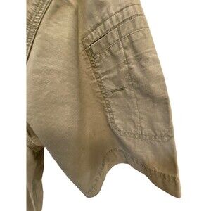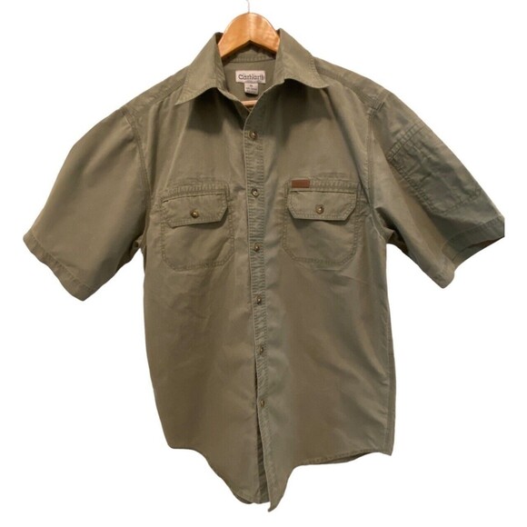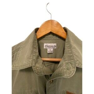 Carhartt men's shirt for casual or work wear. The short-sleeve button-up shirt features a collared neckline and solid pattern in green color. It is made of cotton fabric type and has a canvas texture. The shirt comes in size M and has pockets. The Carhartt logo is also visible on the shirt.