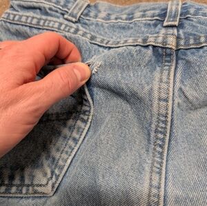 Staining throughout. Has one small hole developing around the back pocket- see photo