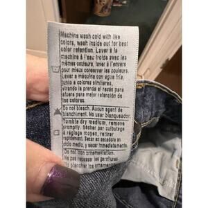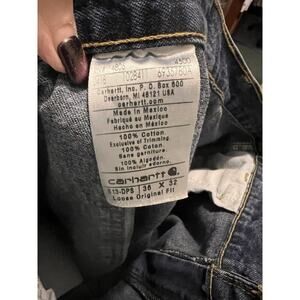 This is a Carhartt men's pair of jeans in size 36x32. The jeans are blue in color and have a solid pattern. They are made of cotton denim fabric with a medium wash. The closure is a zip type and the garment care is machine washable. The jeans have accents of the Carhartt logo and features including a hammer loop and pockets. They are designed with an original fit and are perfect for work, cowboy, and USA themed events. The brand is Carhartt and the type is jeans.