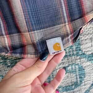 A men's Carhartt long-sleeve button-down shirt in a size large. The shirt features a plaid pattern with blue, red, and off-white colors, a button-down collar with a contrasting lining, and a single chest pocket with a Carhartt logo patch.
