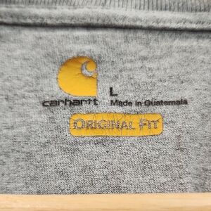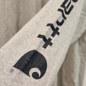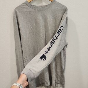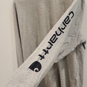 Used Men's Carhartt Original Fit Grey Long Sleeve Shirt with Printed Logo Down Sleeve. Please see all photos for signs of wear.