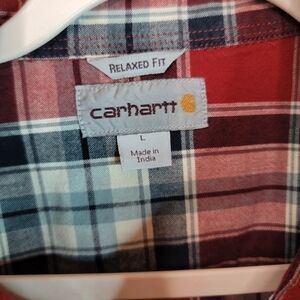 Fantastic condition! Men's Carhartt Red White and Blue Plaid Double Pocketed Work shirt in Relaxed Fit. Size Large. Casual but high quality fabric and durability. Carhartt label on hem and pocket.
