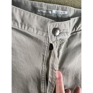 Carhartt, Men's Rugged Flex Relaxed Fit, Twill Dungaree, Utility Work Short. Size: 40X11. This short is in excellent condition and features multiple pockets.