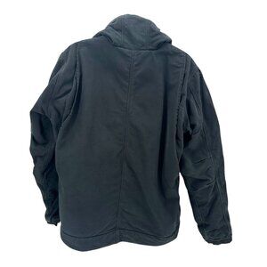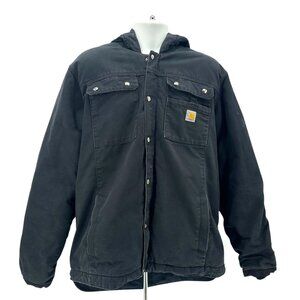 Carhartt Relaxed-Fit Washed Duck Sherpa-Fleece Lined Utility Jacket - Style #: 0J3826-M - Long sleeve hooded black sherpa fleeced lined coat jacket. Full zipper down the front with snap buttons. 2 front pockets, 2 upper snap button pockets & 1 small upper pocket with the Carhartt logo sewn on. Made of a thick canvas fabric. Inner gray sherpa fleece lining at the body & inside the hood. Black quilted fabric lining inside the sleeves. Shell: 100% Cotton, Body Lining: 100% Polyester, Sleeve Lining: 100% Nylon, Sleeve Interlining: 100% Polyester. Made in Indonesia.