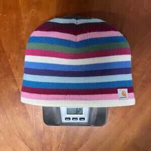 Carhartt beanie with white, pink, red, blue, purple, grey, and brown stripes in various shades.