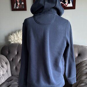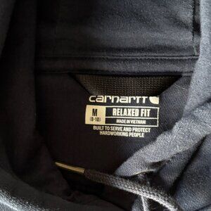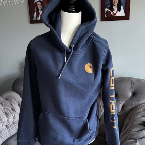 Navy hoodie with gold Carhartt logo and sleeve detail. Cozy and versatile.