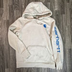 This is a Carhartt relaxed fit pullover hoodie in off-white / cream tone with a bold blue logo on the sleeve and a small chest logo. Interior is soft fleece. Hood has drawstring with metal aglets. No holes, tears, or major stains visible (see photos). Great for layering or everyday streetwear looks.
