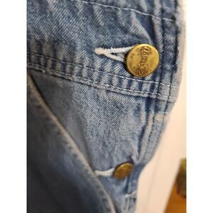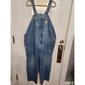 Carhartt Overall Mens Wide Leg Carpenter Adjustable Straps Distressed 48x26 GUC. NO SIZE TAGS. MEASUREMENTS IN PICS. HEMMED?? Some fraying around the top and patch on leg, see pics. Pre-owned, overall good condition.