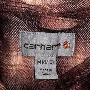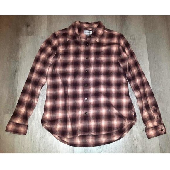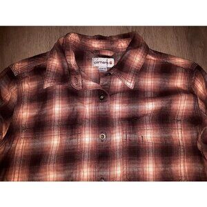 Women's Carhartt pink and brown plaid button up long sleeve flannel shirt. Size MEDIUM. Button down closure. Very good condition. No stains or holes.