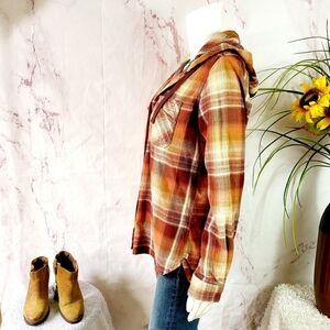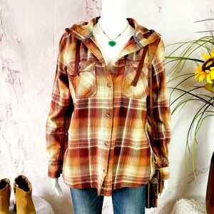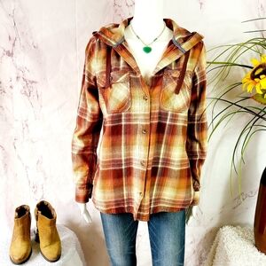 Excellent condition no flaws Carhartt heavier weight flannel shirt jacket with hood. Stylish plaid button-up shirt with a hood. Features a blend of warm colors. Size small