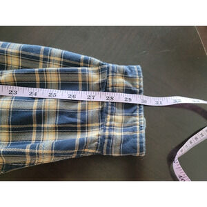 Carhartt men’s long sleeve flannel shirt, size Large. Soft cotton fabric in navy, gold, and tan plaid. Classic button-up style with chest pocket and relaxed regular fit — perfect for layering or casual workwear.