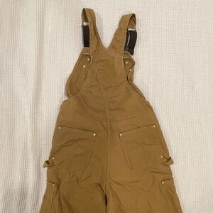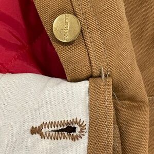 Carhartt R41 - Duck Zip-to-Thigh Bib Overall - Quilt Lined. Carhartt Insulated Overalls. Brown:tan canvas overalls with red quilted lining. R41 Brown. Color may vary in-person. Pockets galore and a midweight quilt lining. The chap style double front features a clean out bottom that can accommodate knee pads. Suspenders are dark brown with an off-white underside. Discontinued style.